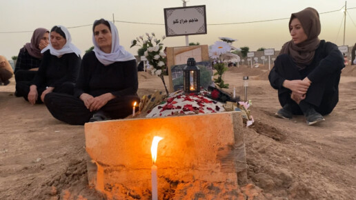 Frauen trauern an einem Grab in Kocho. Hier ist ein neuer Friedhof entstanden. Ezid_innen, deren menschliche Überreste aus den umliegenden Massengräbern exhumiert wurden, wurden hier beigesetzt. Inzwischen ist dieser Friedhof zu einem allgemein von Ezid_innen aufgesuchten Erinnerungsort geworden. © Faris Mishko